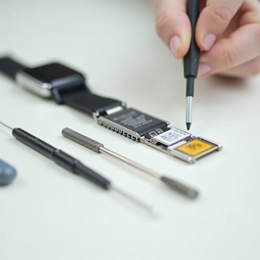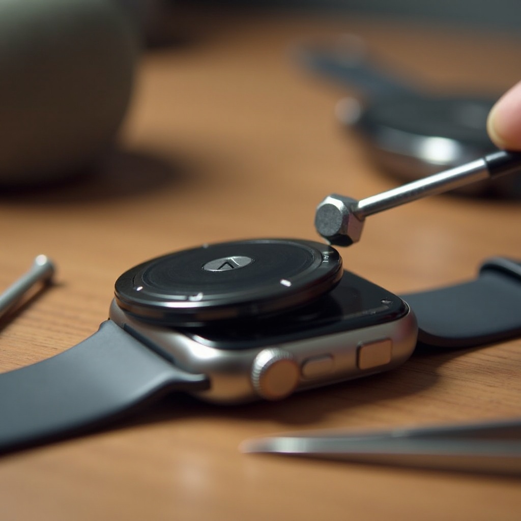 Apertura Segura del Reloj Inteligente: Utiliza el destornillador para retirar cuidadosamente los tornillos de la parte posterior del reloj. Con las pinzas, retira la tapa trasera con precaución.